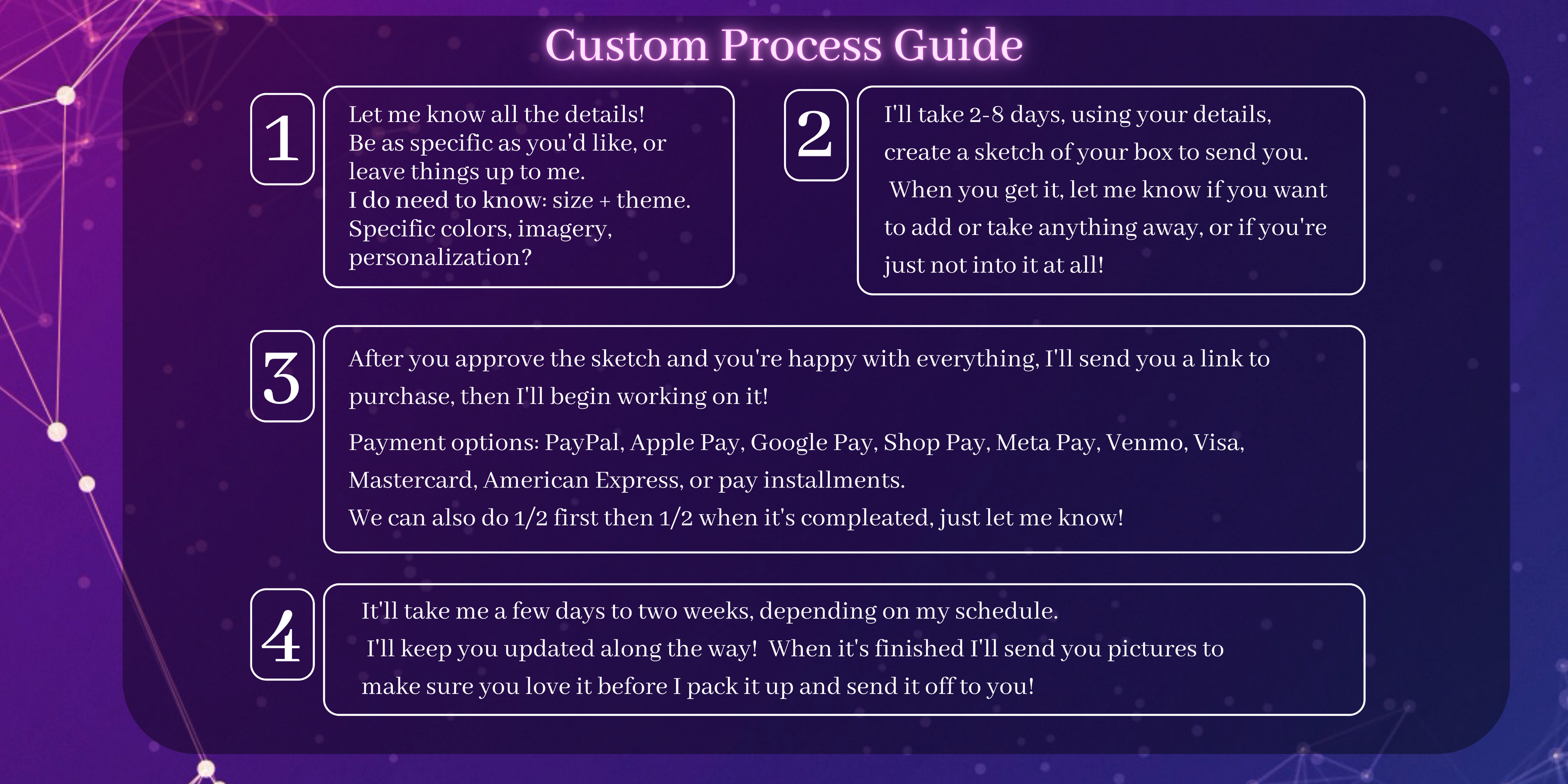 When I have avalibility for Custom Work again, I will send out an email update with all the information. Sign up if you'd like updates from Lunar Art House, including Custom Work avalibility.